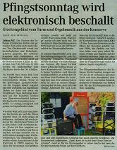 Lebien/MZ. Die Glocken des Lebiener Kirchturms dürfen seit geraumer Zeit schon nicht mehr läuten. Der Glockenstuhl wurde aus bautechnischen und Sicherheitsgründen gesperrt. Die Lebiener brauchen zum Gottesdienst am Pfingstsonntag trotzdem nicht auf die wohlvertrauten Klänge zu verzichten. Um 9.30, 9.55 und 11 Uhr werden sie unüberhörbar vom Kirchturm durch den Ort schallen.